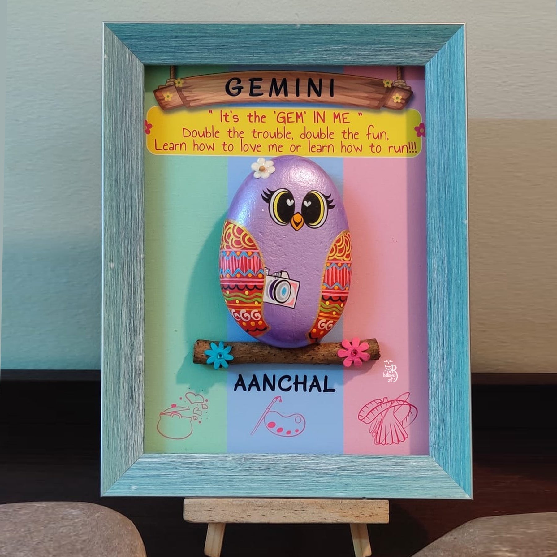 लकड़ी पर हाथ से पेंट की गई इस मनमोहक कंकड़ कला के साथ मिथुन राशि वालों का जन्मदिन मनाएँ। जीवंत रंगों की विशेषता, यह प्यार और खुशी को दर्शाता है। दीवार की सजावट के लिए बिल्कुल सही, यह एक आकर्षक और विचारशील उपहार है।