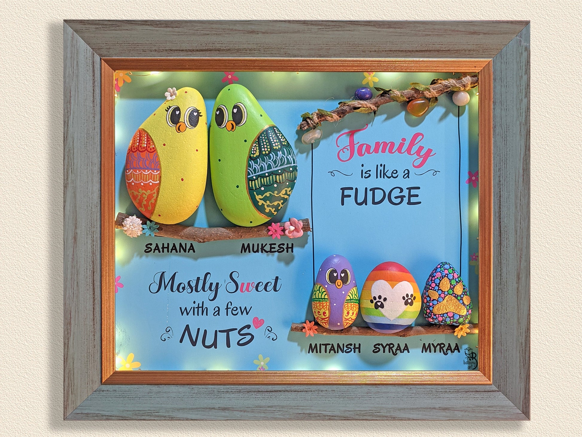 अपने परिवार को कला के एक खास टुकड़े से नवाज़ें! 5 लोगों का हमारा क्षेत्रीय परिवार यादों को मज़ेदार और अनोखे तरीके से संजोने का एक बेहतरीन तरीका है। कंकड़ कला के साथ व्यक्तिगत और हस्तनिर्मित, यह डिज़ाइन एक अनोखा उपहार है जिसे आप आने वाले सालों तक संजो कर रखेंगे! आइए, इस शानदार कला को मिस न करें!