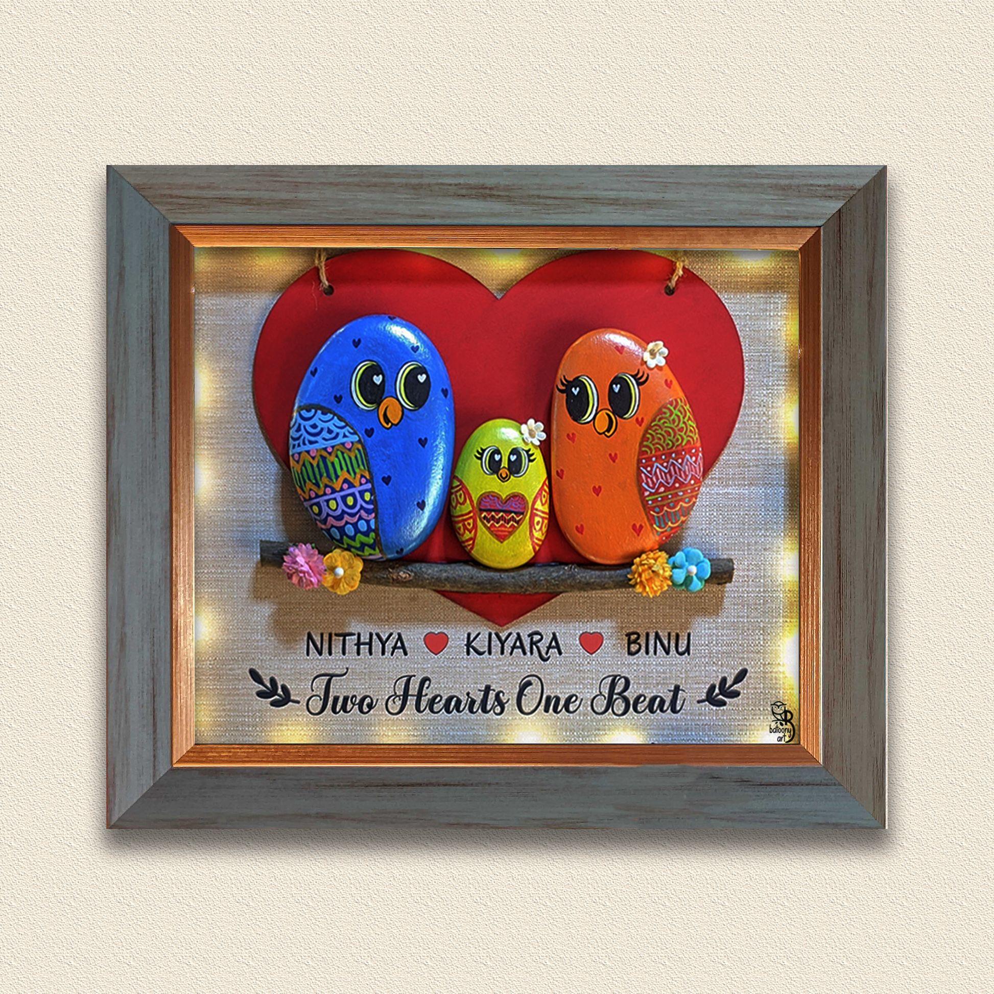 तीन लोगों के परिवारों के लिए "दो दिल, एक धड़कन" पेश है - एक आकर्षक 12x10-इंच लकड़ी की दीवार सजावट। प्यारे, जीवंत रंगों में हाथ से पेंट की गई कंकड़ कला खूबसूरती से परिवार, प्यार और खुशी के सार को पकड़ती है, जो पूर्ण सामंजस्य में तीन दिलों की अनूठी एकता का जश्न मनाती है।