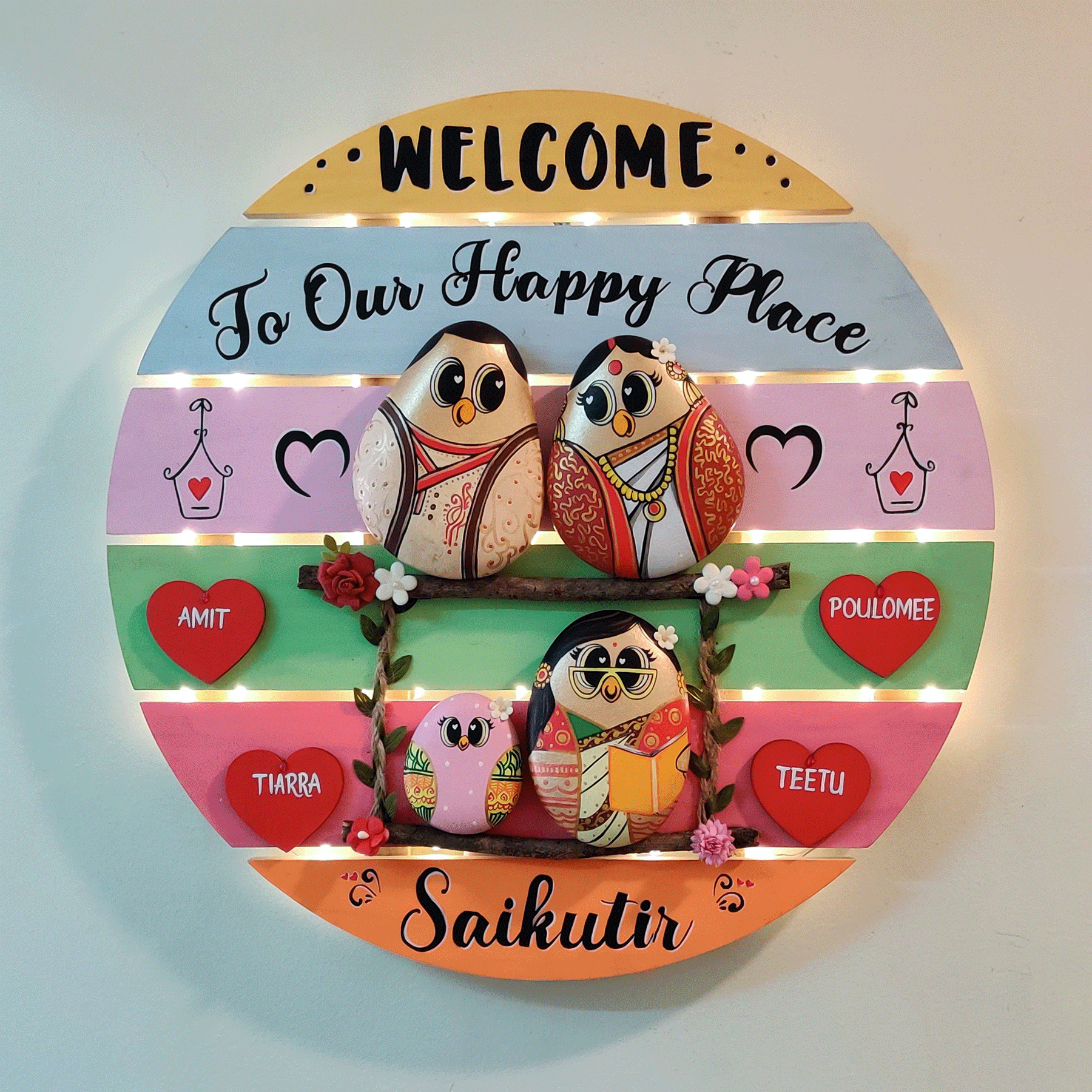 "इस गोल 15 इंच की लकड़ी की दीवार सजावट के साथ अपने स्थान में खुशी का संचार करें। सुंदर, जीवंत रंगों में हाथ से चित्रित कंकड़ कला चार लोगों के एक जीवंत परिवार के प्यार, बंधन और खुशी को प्रसारित करती है।"