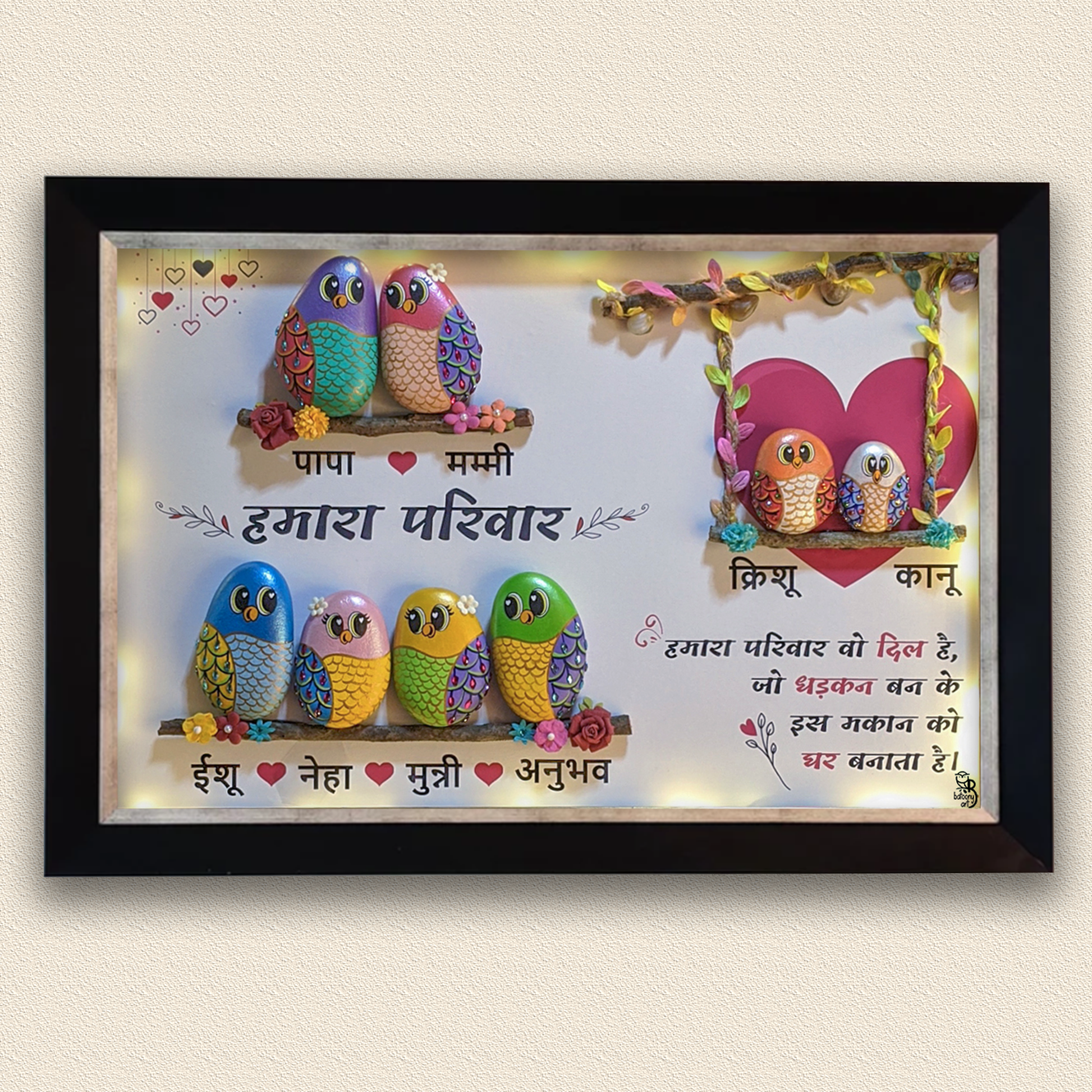 "पेबल बॉन्डिंग यूनिटी" एक दिल को छू लेने वाला होम डेकोर पीस है जिसमें लकड़ी पर हाथ से पेंट की गई पेबल आर्ट में 8 लोगों का परिवार दिखाया गया है। इसका प्यारा, जीवंत डिज़ाइन प्यार और खुशी का प्रतीक है, जो इसे एक प्रिय उपहार बनाता है।