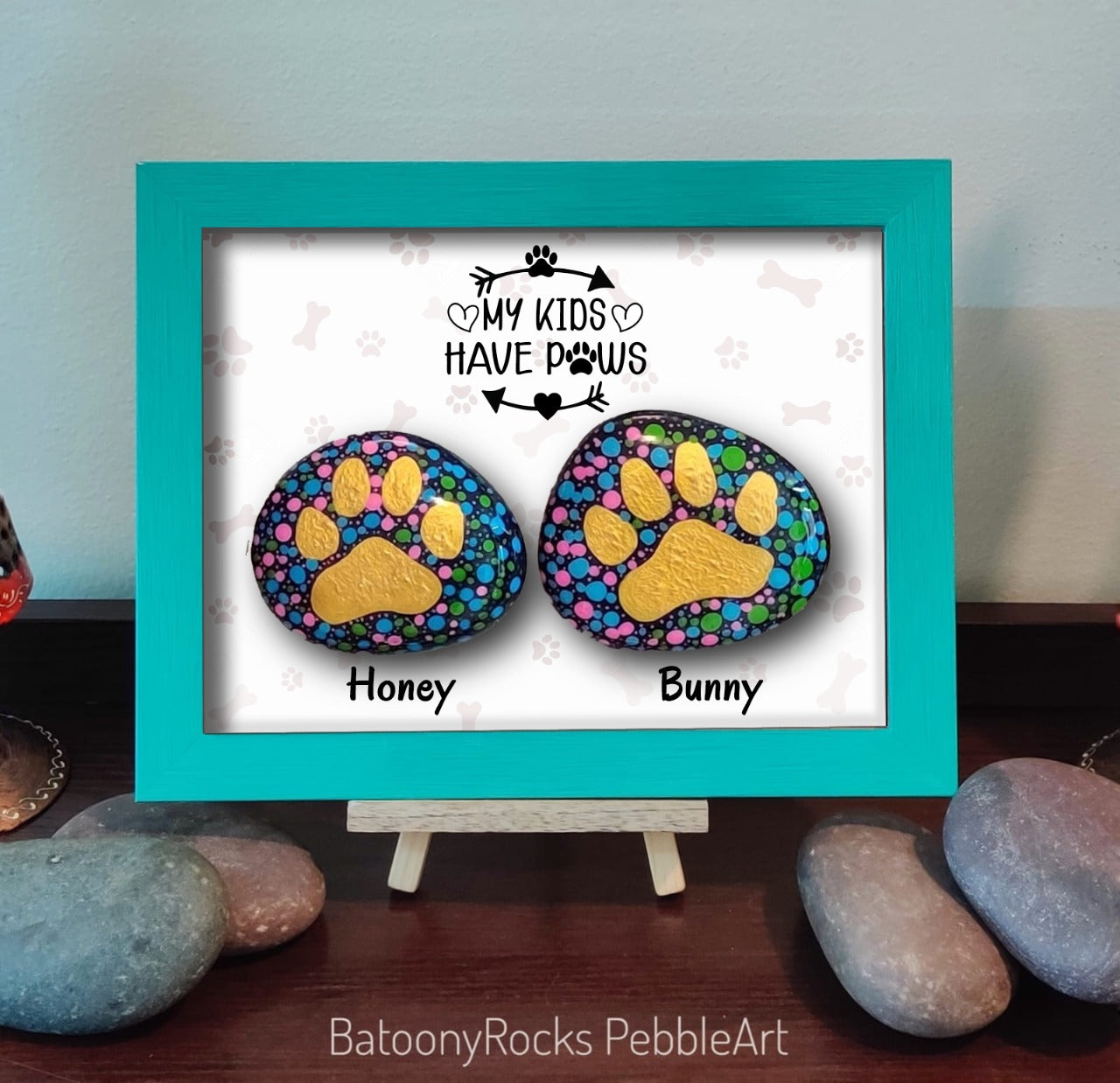Remind yourself of your furry best friend with the "Pawsome Memories" pebble art! This handmade, unique and personalized piece of home decor is handpainted on natural pebbles, making it the purrr-fect gift for pet-lovers!