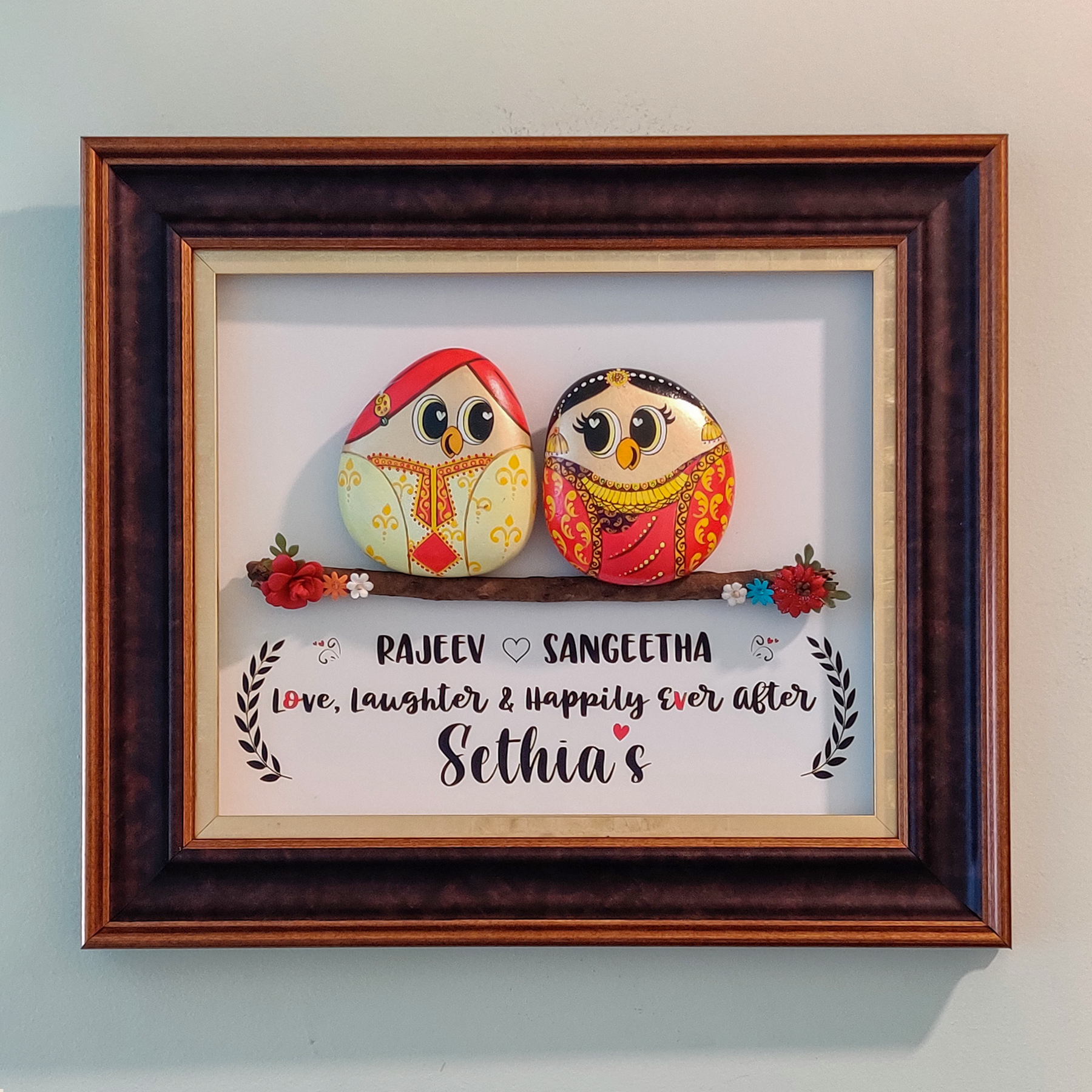 Introducing "Eternal Joy Harmony," a 14x12-inch wooden wall decor for couples. Hand-painted pebble art in cute, vibrant colors celebrates the trifecta of love, laughter, and happily ever after—a heartwarming tribute to lasting joy.