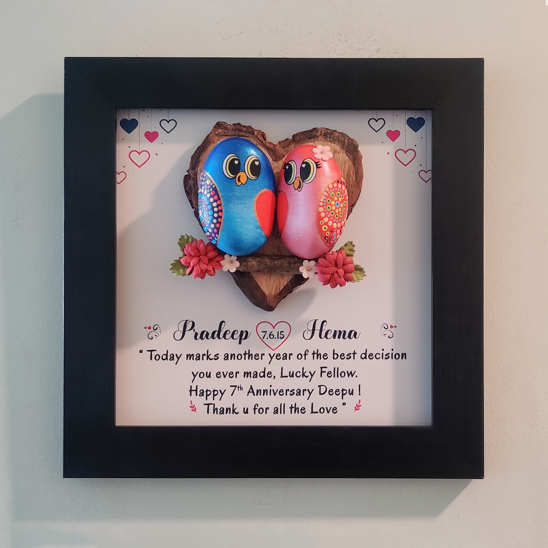Introducing "Seven Years of Bliss," a 12x10-inch wooden wall decor for him. Hand-painted pebble art in cute, vibrant colors celebrates the joyous milestone of a happy 7th anniversary, embodying love, commitment, and happiness.