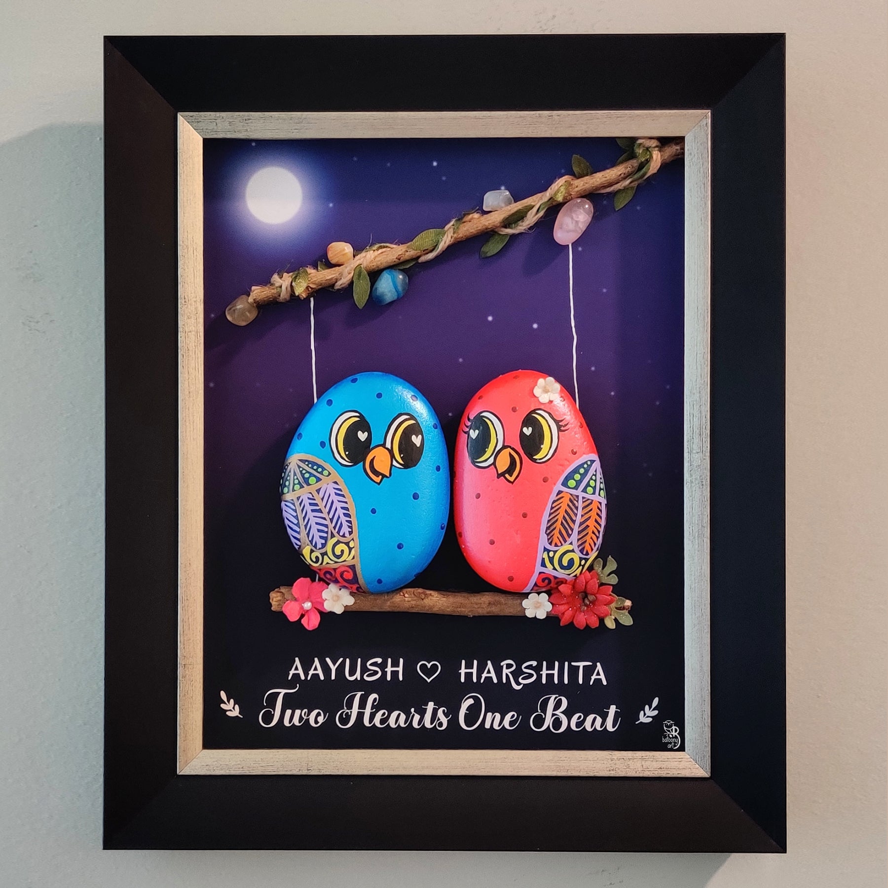 Surprise your loved one with the Couple on Branch Night Sky (Red Blue), a unique and romantic home decor piece. This handmade, hand-painted personalized frame features natural pebbles with impeccable attention to detail. It's the ultimate symbol of affection, perfect for any special occasion.