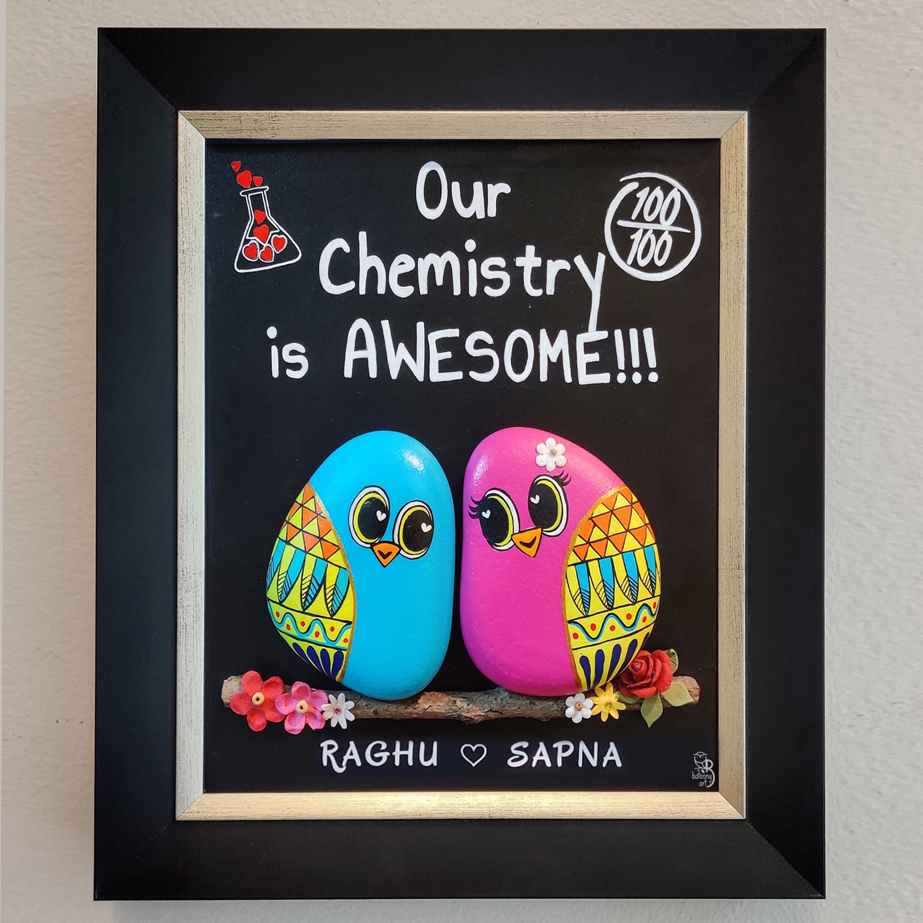 Celebrate your awesome chemistry with our handmade pebble art that looks sweet and cherishes those special memories between you and your better half! This perfect home decor is designed to show off that special spark. Ideal for personalized gifts and unique home decor, this artistic piece captures the essence of your cherished moments together.