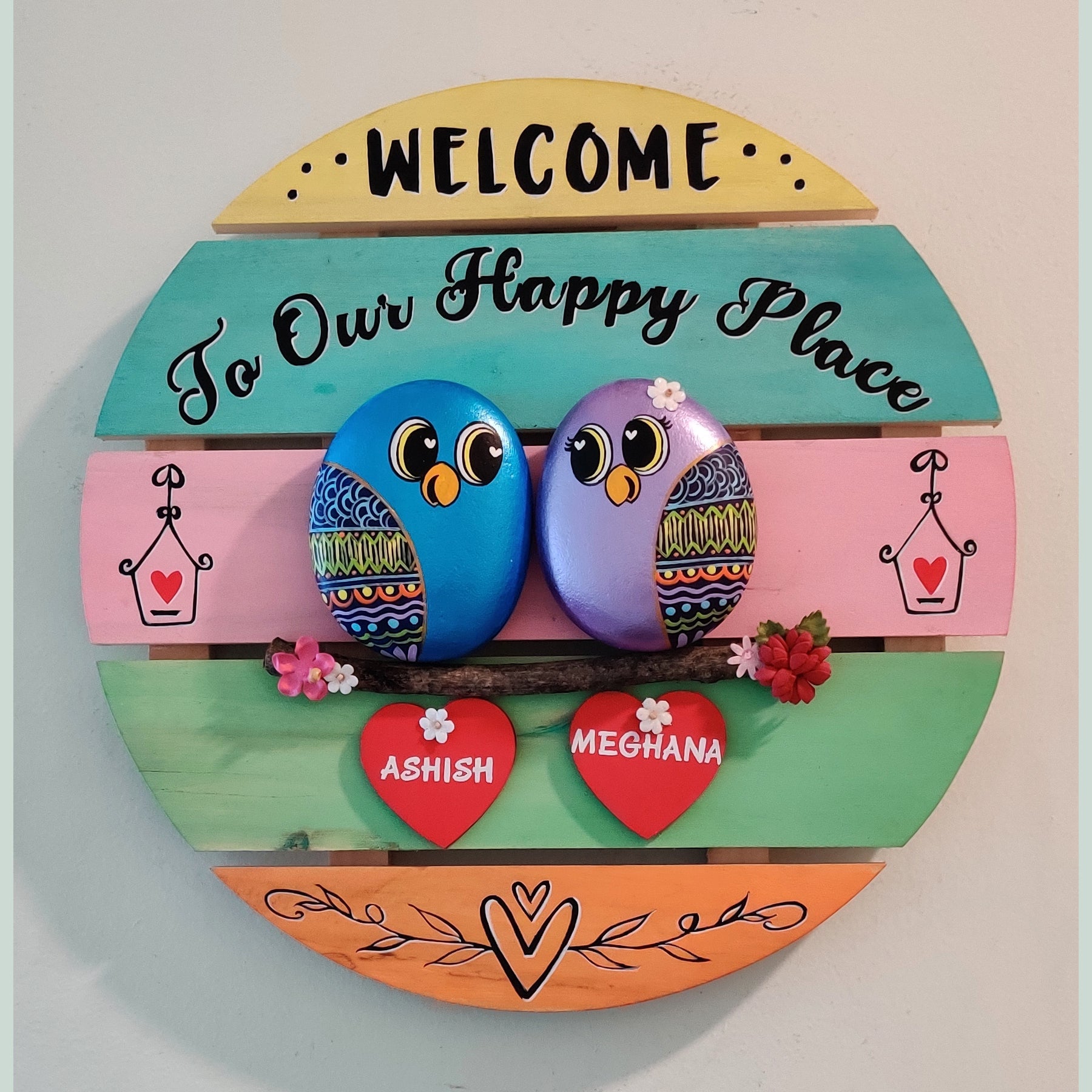 Welcome guests to your home with our "Welcome to Our Happy Place" nameboard! This 12-inch wooden sign radiates warmth and invites everyone into your sanctuary. Handcrafted with care, it adds a charming touch to your entryway or living space, making it a delightful personalized home decor accent.