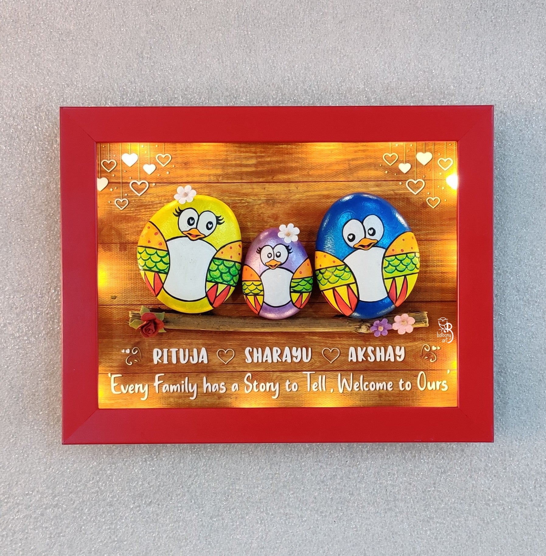 Welcome the family of three into your home with this unique handmade wooden texture background. It's the perfect way to add a personalized touch and show your love. Plus, the cute, creative hand-painted design on natural pebbles will bring a lovely charm to any room!