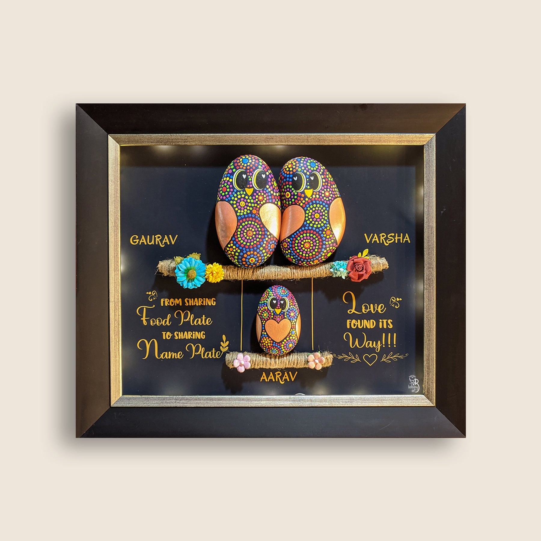 "Transform your home with this heartwarming 14x12 inch wooden wall decor, capturing the journey from sharing food plates to sharing a nameplate for a family of three. Hand-painted pebble art in vibrant colors radiates love, bond, commitment, and romantic happiness.