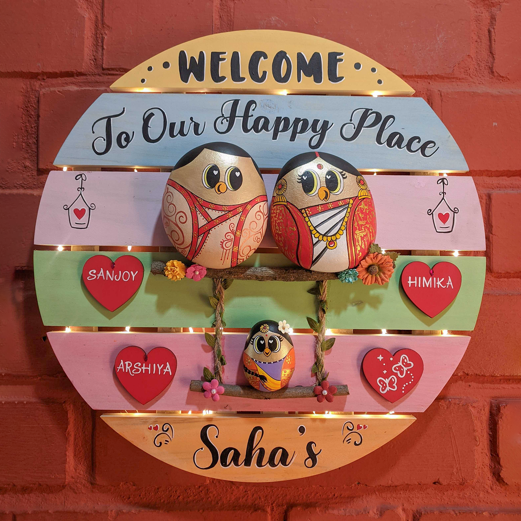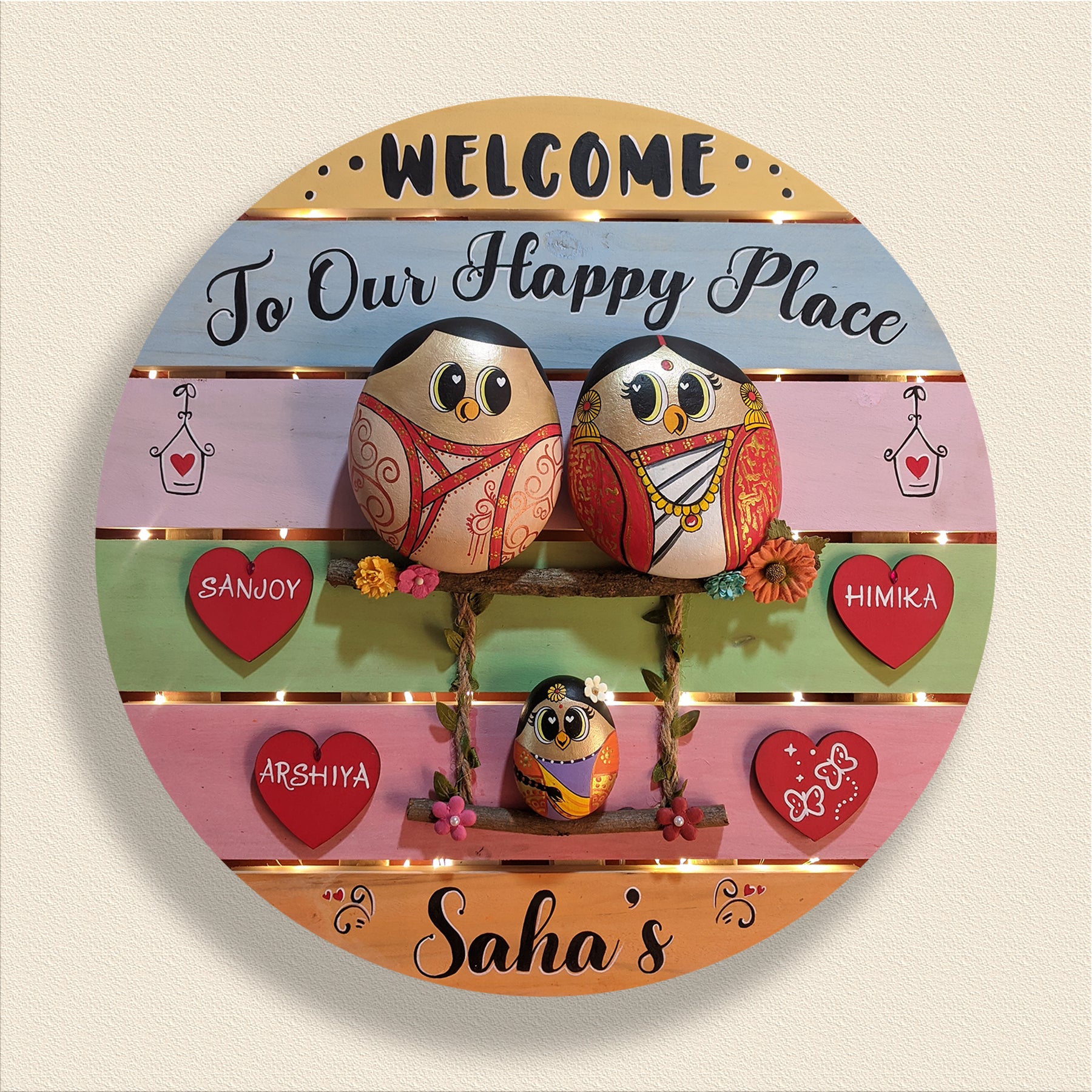 "Introduce warmth to your Bengali abode with this round 15-inch wooden wall decor. Hand-painted pebble art in vibrant colors radiates the love, bond, and happiness of a cherished family of three."