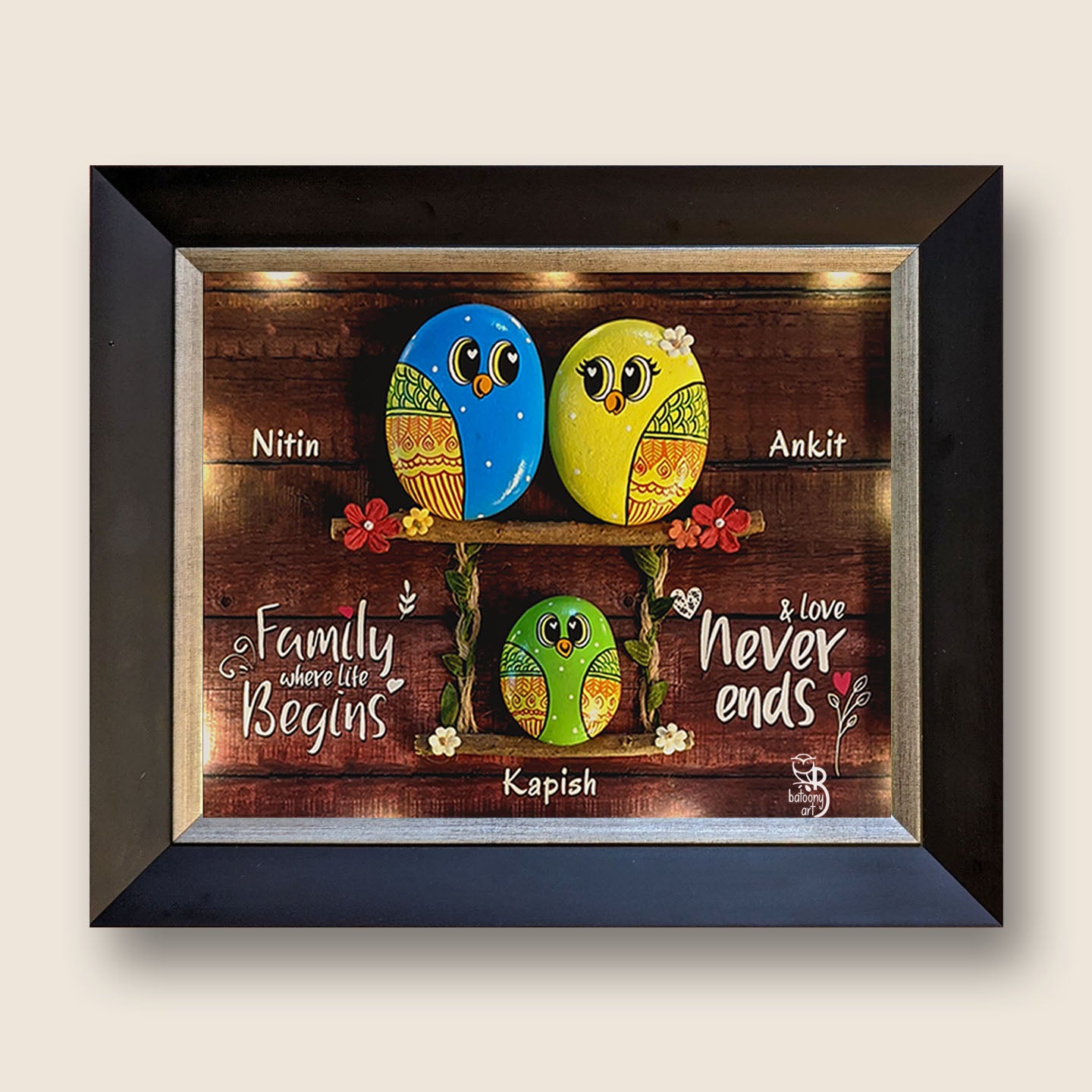 Introducing "Family where life begins, and love never ends," a heartwarming 12x10-inch wooden wall decor. Hand-painted pebble art in cute, vibrant colors celebrates family, love, and enduring happiness—a perfect addition to your home's heartfelt ambiance.