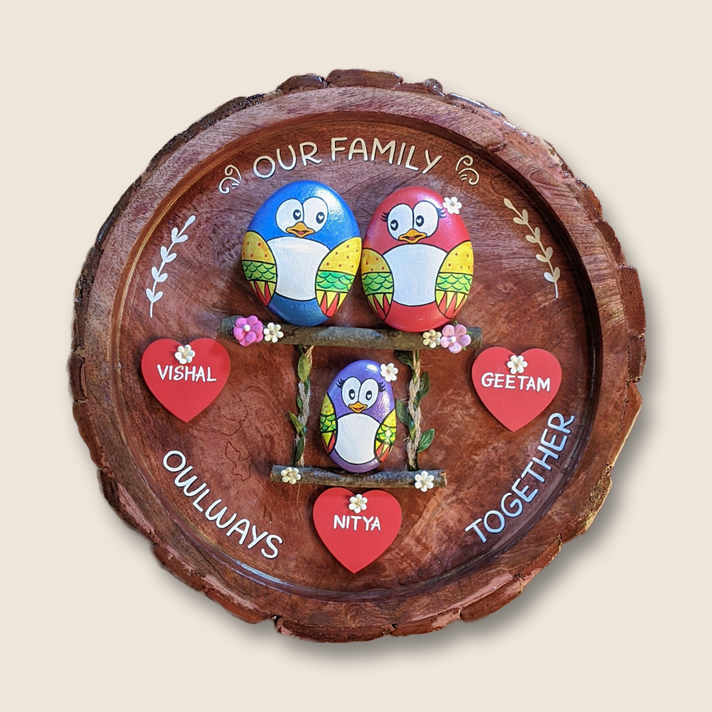 Introducing "Our Family, Owlways Together," a heartwarming 13-inch round wooden wall decor piece. Adorned with meticulously hand-painted pebble art, this charming creation in cute, vibrant colors radiates love, bond, and happiness. Perfectly capturing the essence of family, it's a timeless addition to your home, symbolizing enduring unity and joy.