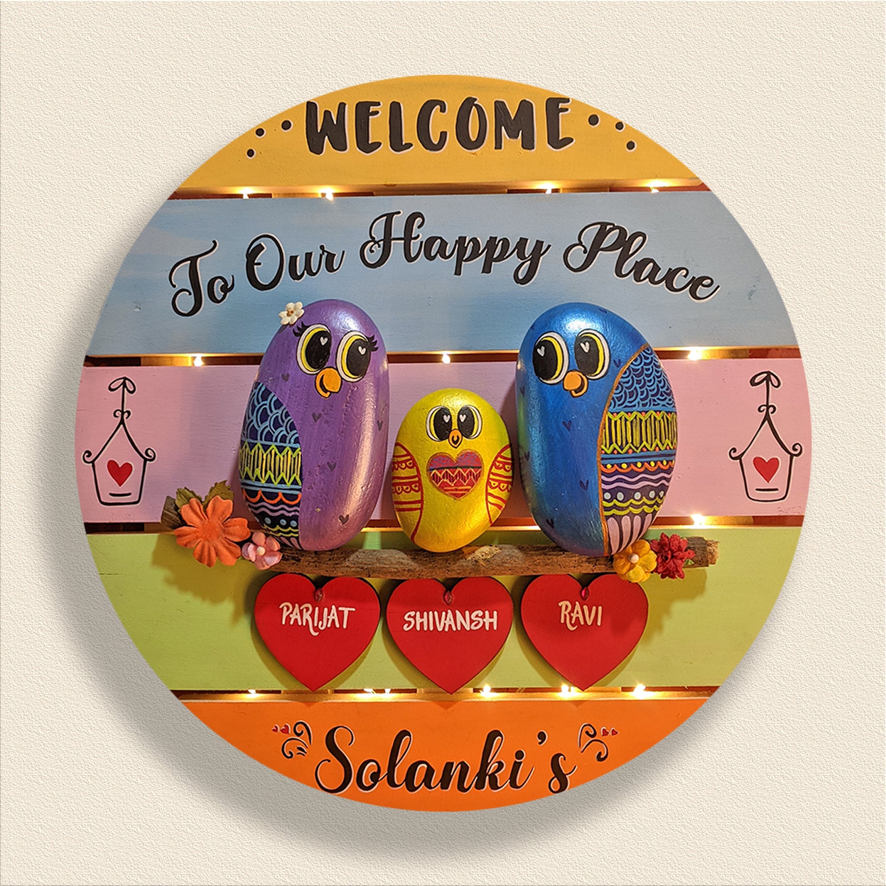 Step into joy with "Welcome to Our Happy Place," a 12-inch round wooden wall decor. Hand-painted pebble art in cute, vibrant colors embodies the essence of family, love, and happiness—a charming invitation to your cherished haven.