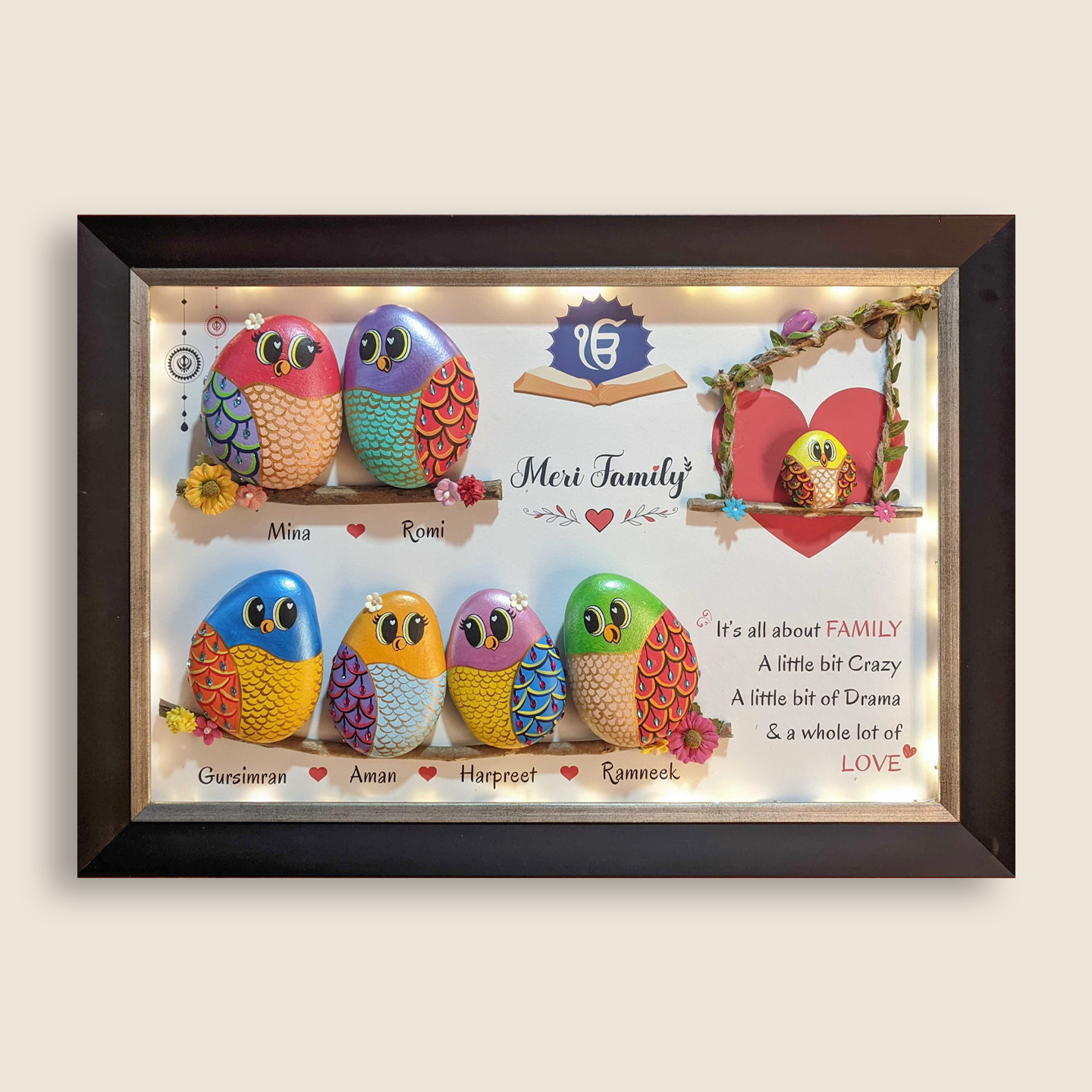 Elevate your home's warmth with our customizable family art piece. Crafted from wood, adorned with hand-painted pebble art, and bursting with vibrant colors. Celebrate love, commitment, and the joy of a larger family.