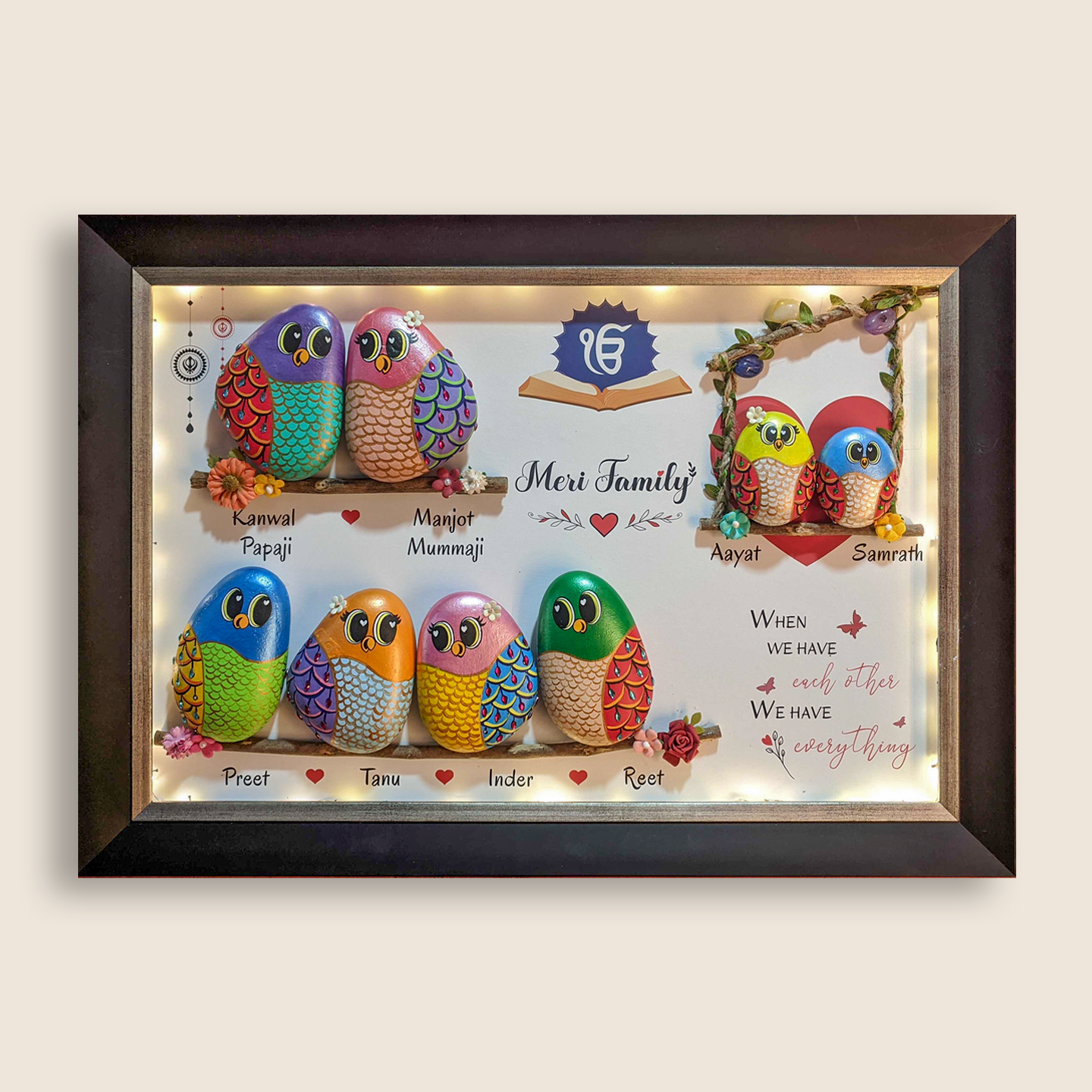 Elevate your home's warmth with our customizable family art piece. Crafted from wood, adorned with hand-painted pebble art, and bursting with vibrant colors. Celebrate love, commitment, and the joy of a larger family.