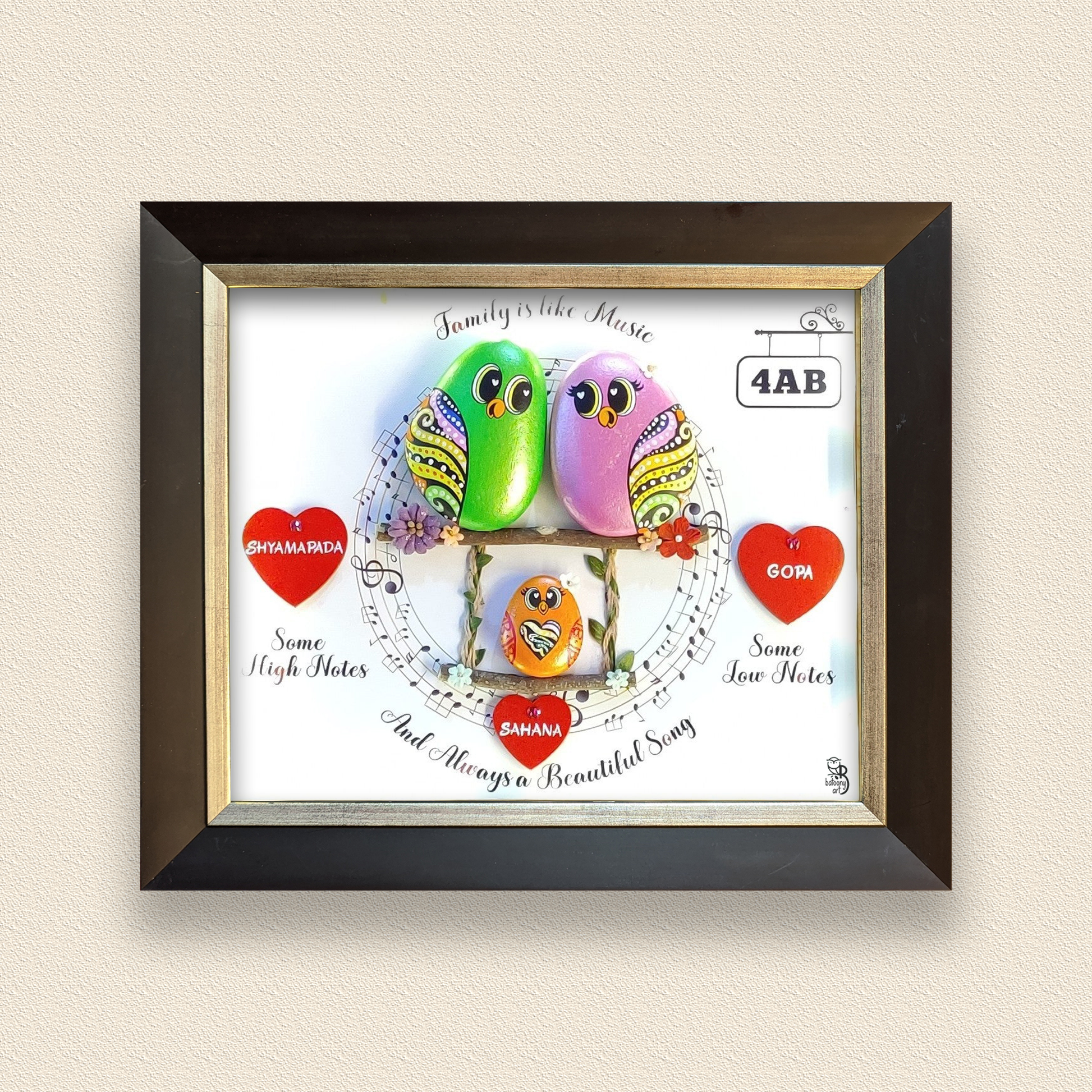 "Transform your home with this heartwarming 14x12 inch wooden wall decor, capturing the journey from sharing food plates to sharing a nameplate for a family of three. Hand-painted pebble art in vibrant colors radiates love, bond, commitment, and romantic happiness."