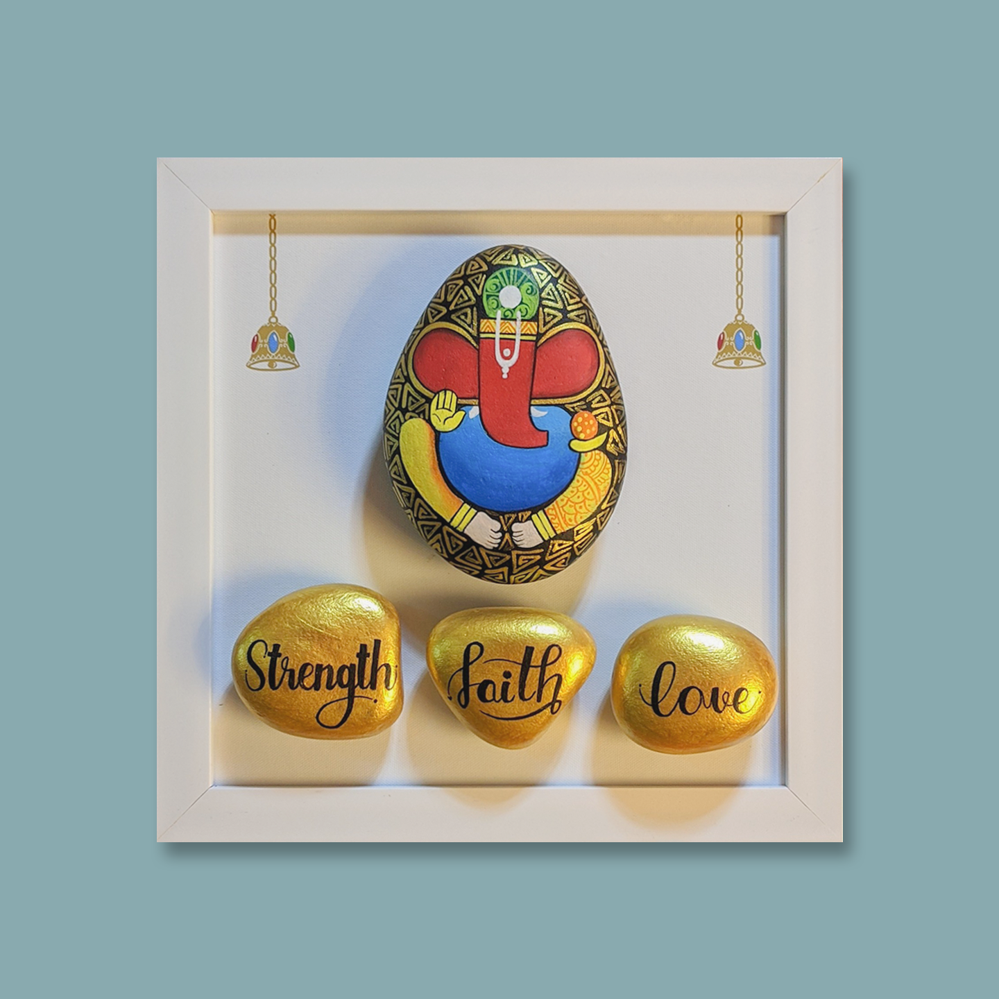 "Faithful Finesse Ganesha" is a divine masterpiece for home decor. This hand-painted pebble art Ganesha, crafted on wood, radiates love and happiness with its cute, vibrant colors. Hang it on your wall for a touch of spiritual finesse.