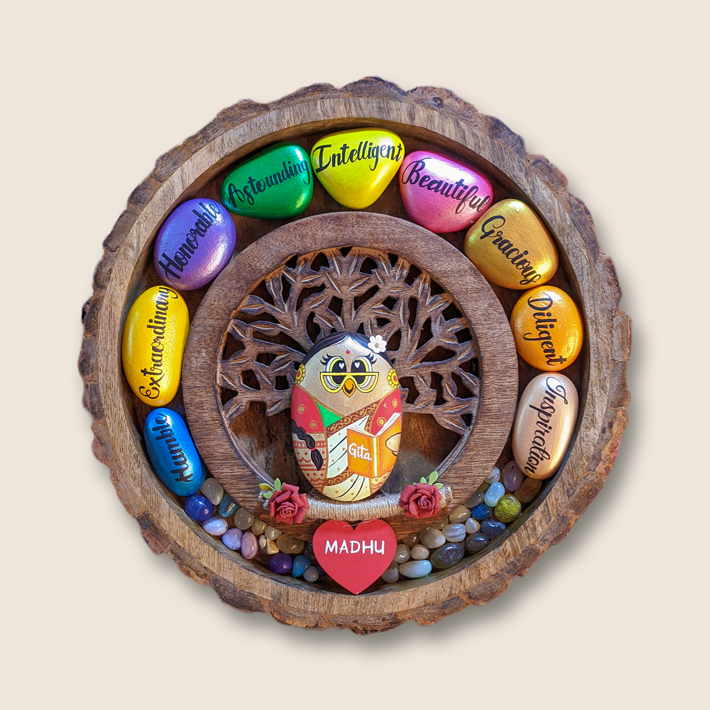 "Mentor Marvel Memento" is a heartfelt expression of gratitude for a beloved teacher or mentor. Crafted from wood, this home decor piece features hand-painted pebble art in cute, vibrant colors, symbolizing the love and happiness inspired by their guidance. Hang it on the wall as a lasting tribute.