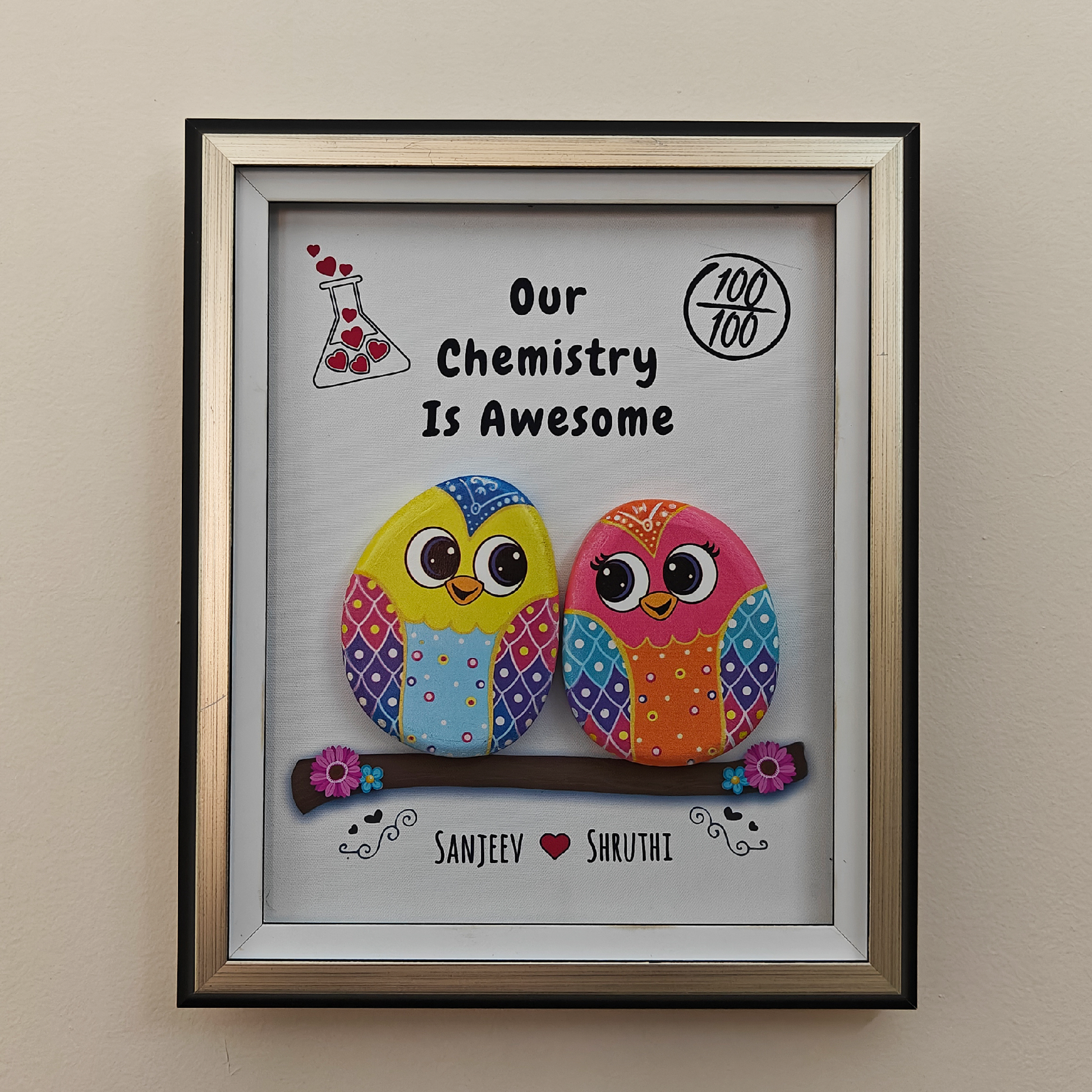Celebrate the perfect match with a quirky, personalized nameplate that brings science and romance together. Featuring fun chemistry-inspired illustrations and colorful art pebbles, this custom door sign adds charm and personality to any couple’s home. Ideal for gifting, new houses and any special occasions.