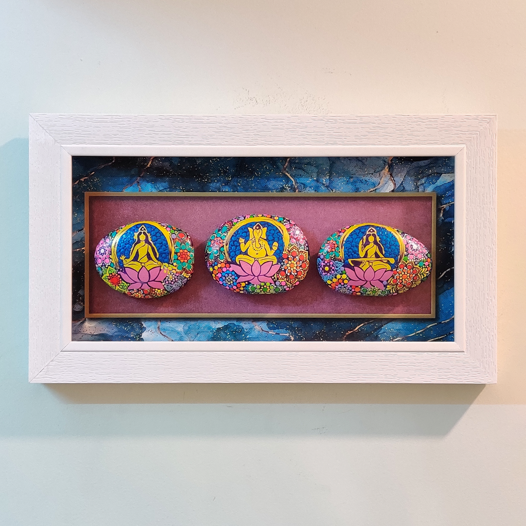 "Invoke prosperity, wisdom, and creativity with our Laxmi, Ganesha, Saraswati Trio. Hand-painted pebble art on wood, this home decor piece radiates positive energy. Ideal for gifting blessings and joy."