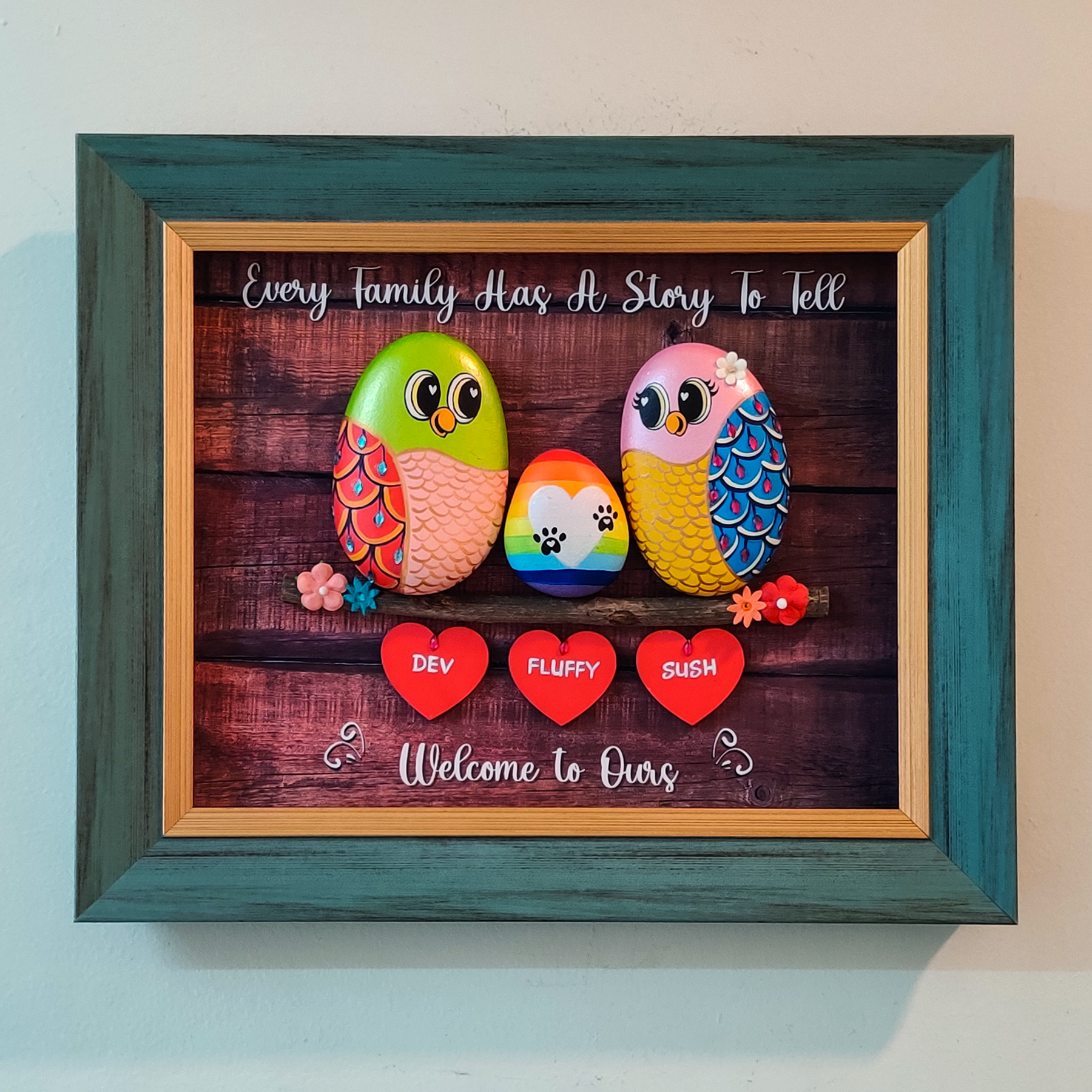 "Cherished Companions - Pet Dog" captures the essence of love with hand-painted pebble art on wood. This heartwarming home decor piece, a perfect gift, radiates joy, vibrant colors, and the unique bond between pet and family.