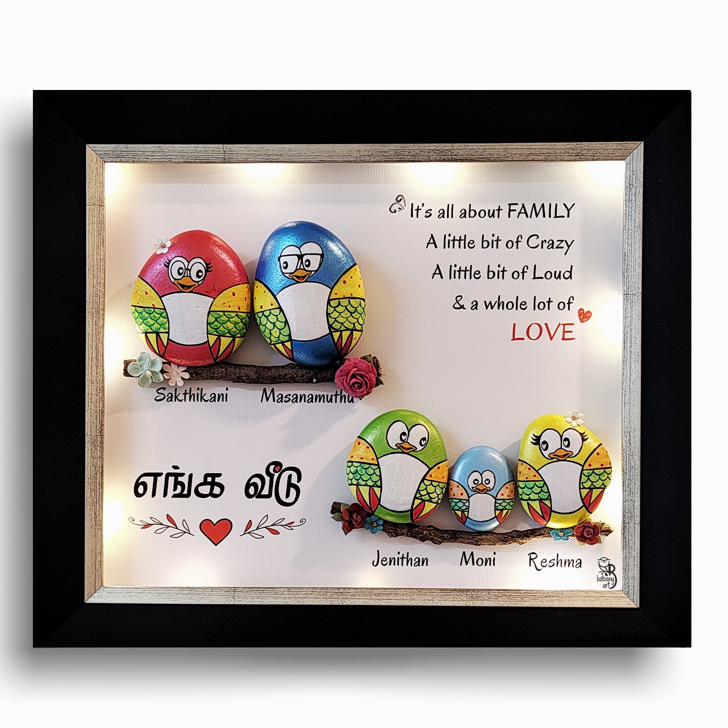 Treat your family to a special piece of art! Our Regional Family of 5 is the perfect way to capture memories in a playful, unique way. Personalised and handmade with pebble art, this regional language design is a one-of-a-kind gift that you'll cherish for years to come! Come on, don't miss out on this fam-tastic art!