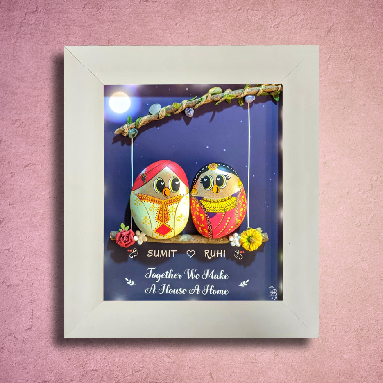 Surprise your special someone with this unique and romantic couple on a branch night sky nameplate. With this beautifully handpainted pebble art housed in an imported and elegant frame, this creative home decor is sure to add an extra touch of love to your home.