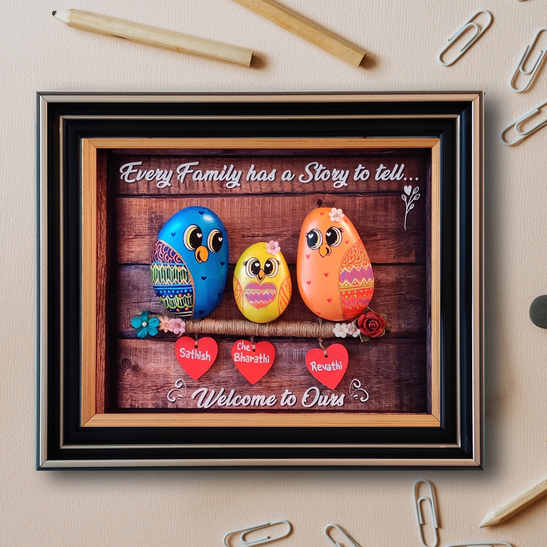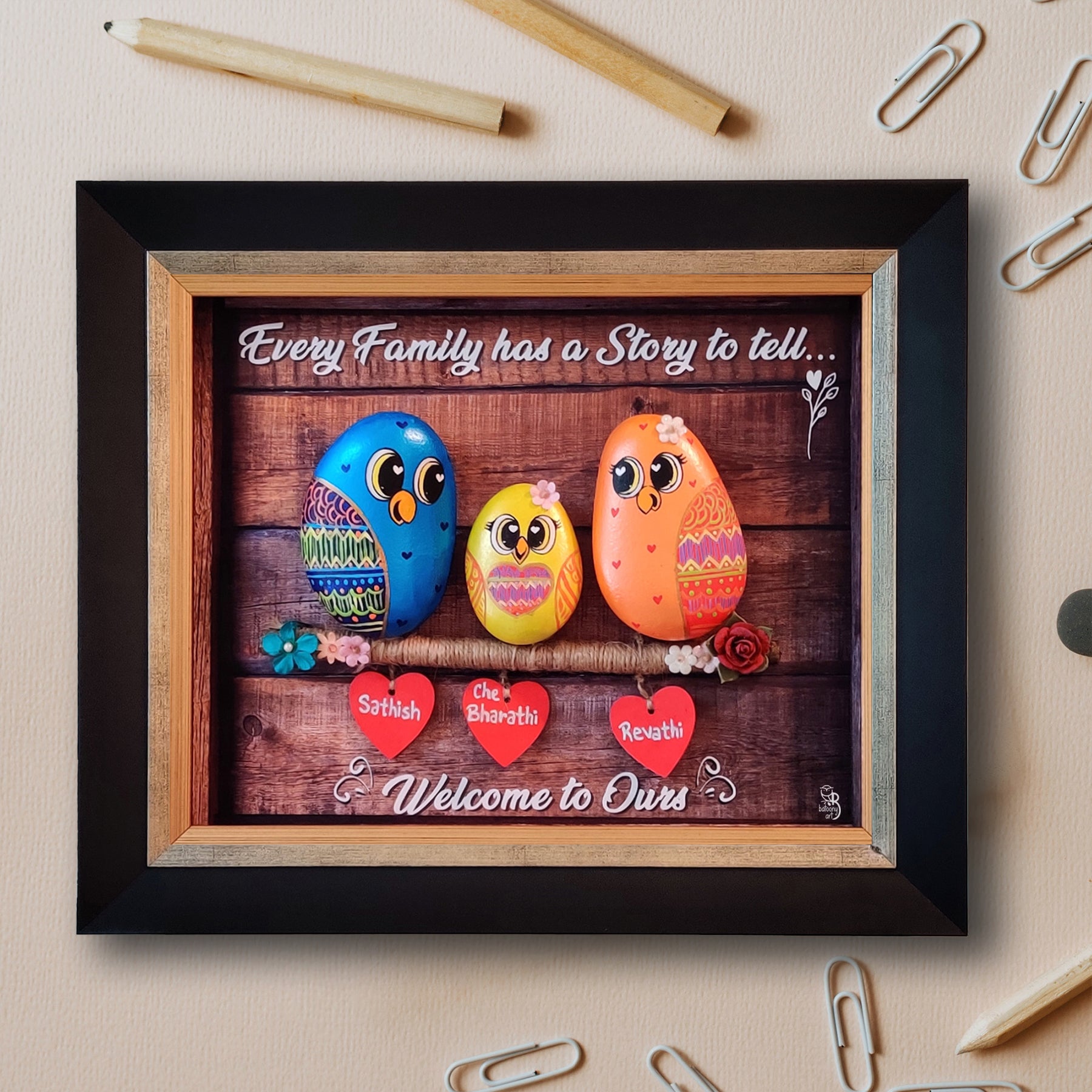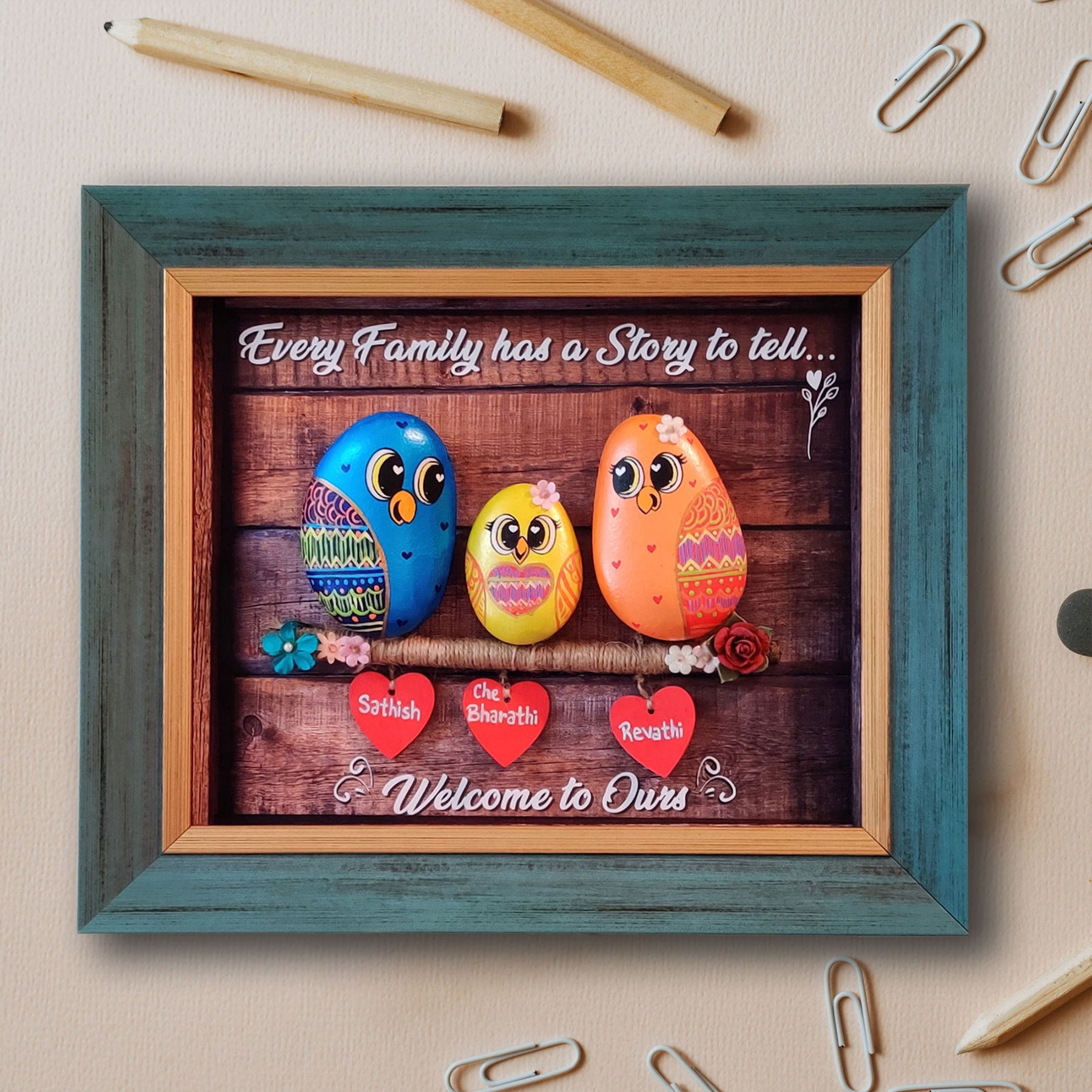 "Batoony Stone Birds" features a family of three on a wooden background. This charming home decor piece is crafted with wood and adorned with hand-painted pebble art in vibrant colors, radiating love and happiness.